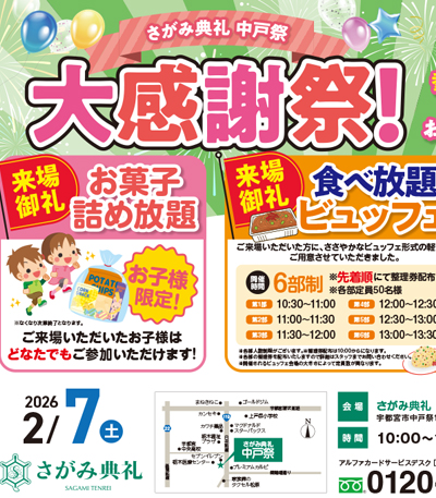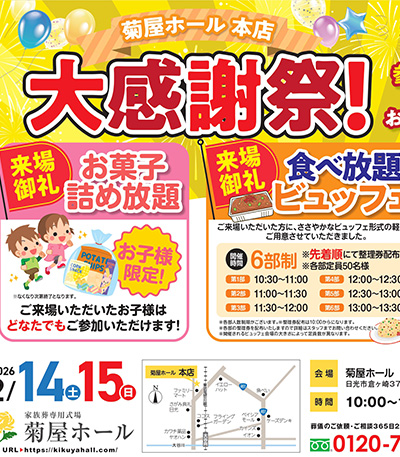 HOME アルファクラブのイベント 日頃のご愛顧に感謝を込めて、アルファクラブからの心からのおもてなし!!様々なイベントを用意してお待ちしております。ご家族、ご友人、皆様でご来館ください。スタッフ一同お待ちしております。 ※「ポイント付与」に関しましては、イベントにより付与の有無がございますので、詳しくは各イベントのチラシをご確認ください。 今月のイベント 開催日 2月7日 10時~14時 会場 さがみ典礼 中戸祭 大感謝祭 お問い合わせ 開催日 2月8日 10時~14時 会場 さがみ典礼 栃木昭和町 大感謝祭 お問い合わせ 開催日 2月14日・15日 10時~14時 会場 菊屋ホール本店 大感謝祭 お問い合わせ 開催日 2月14日・18日・24日 10時~15時 会場 さがみ典礼 筑西ホール オープン15周年記念大感謝祭 お問い合わせ 開催日 2月21日 10時~14時30分 会場 さがみ典礼 小山雨ヶ谷 人生会議 お問い合わせ ブライダルフェア・イベントの開催につきましては、各結婚式場のホームページをご確認ください。 ※開催イベントは、会館によって異なります。 ※開催内容は変更になる場合がございます。 ※詰め放題・各種販売イベントはなくなり次第終了となります。 ※ご飯はすべて国内産米を使用しております。